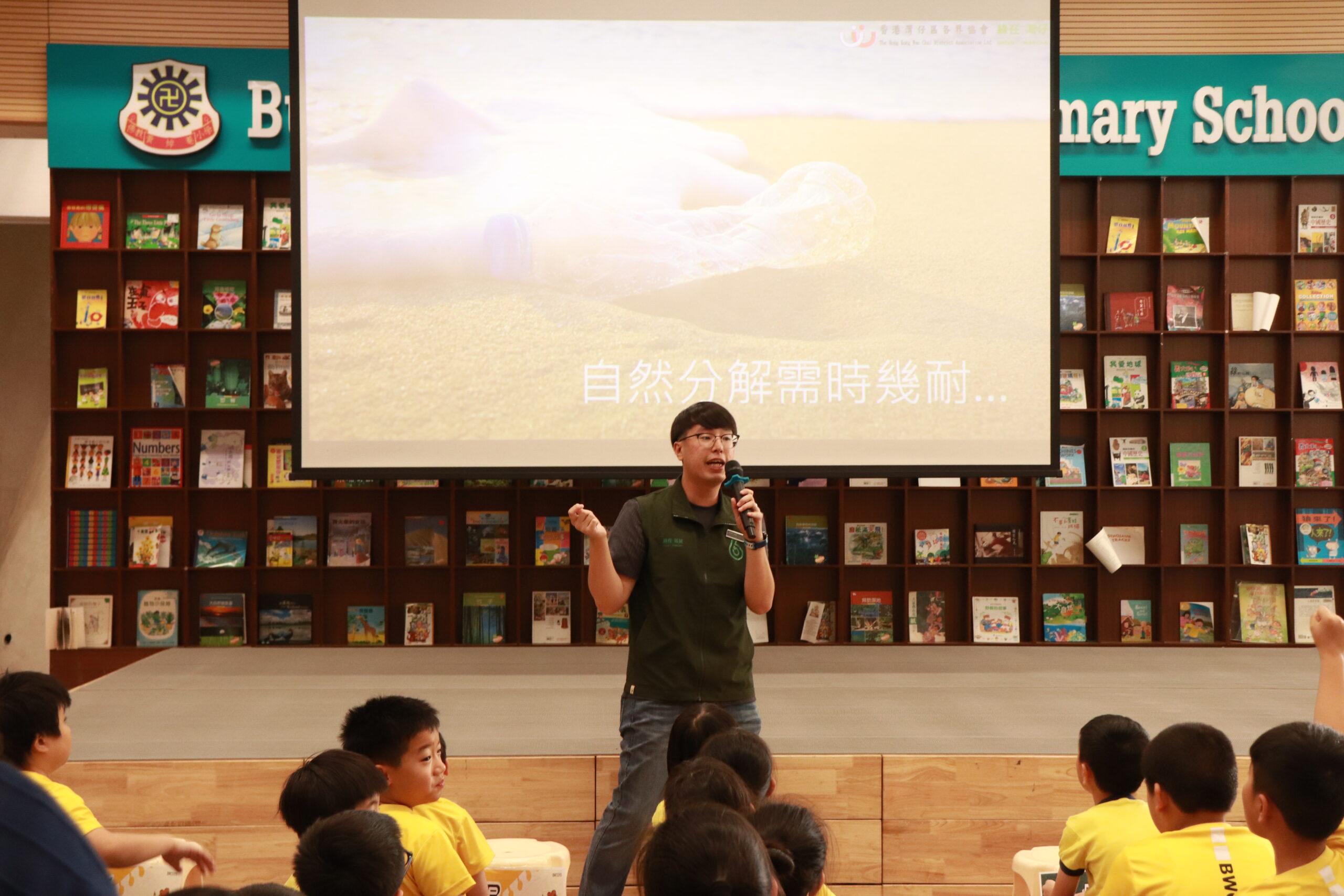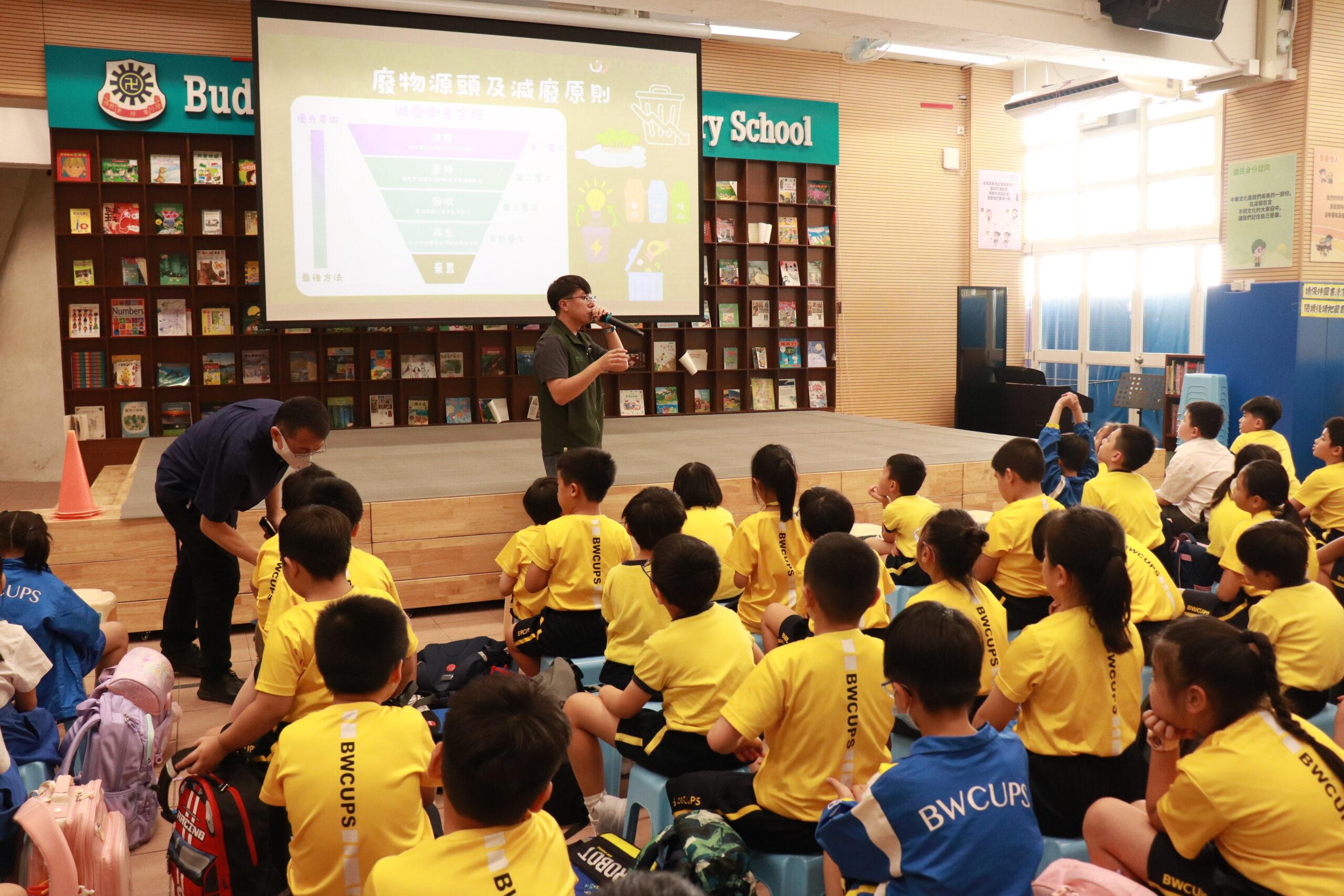 綠在區區(灣仔)教育部職員到本校舉行環保講座 – [環保生活知多少]本講座以「源頭減廢」與「乾淨回收」為主軸,配合《香港資源循環藍圖2035》所提出的減廢策略,向學生介紹實踐可持續生活的方法。